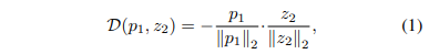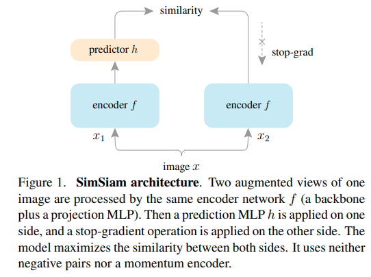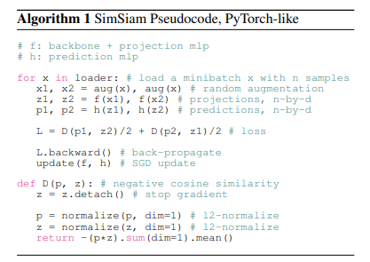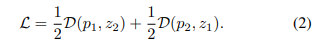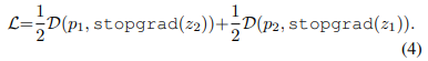 먼저 영상 x에 서로 다른 augmentaion을 가한 x1 = aug1(x), x2 = aug2(x)을 backbone model f (e.g. ResNet)와 Projection MLP에 태워 임베딩된 벡터 z1, z2를 추출합니다. 그 다음 prediction MLP h에 태워 output vector p1과 p2를 추출합니다. 추출된 2 쌍의 벡터는 아래의 수식 1과 같은 negative consine-similarity D(p{1,2}, z{2,1}) 최소화하도록 합니다.