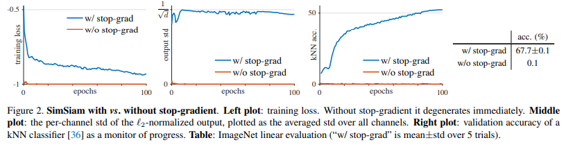 먼저 fig 2의 왼쪽 그래프에서 볼 수 있듯이, 양 쪽에 gradient를 전달할 경우에는 consine-simliarity가 학습 시작과 동시에 -1로 수렴하는 것을 볼 수 있습니다. 이는 대조되는 비교 값이 서로 간에 차별성이 없어진다는 것을 의미합니다. 또한 ‘collapsing’이 output이 상수로 변질된다면, 표준 편차가 ‘0’으로 도달한다는 것을 의미합니다. 이는 출력 값에 대한 표준 편차를 계산한 fig 2 중간 그래프의 빨간 곡선을 통해 대조되는 값이 상수화 된 것을 증명합니다. 마지막으로 fig 2 오른쪽 그래프와 왼쪽 표에서 보이는 바와 같이 output을 이용하여 ImagNet에서의 knn classifier에 대한 결과입니다. stop-grad를 사용한 경우 67.7%의 유의미한 결과를 보이는 반면에 w/o stop-grad는 0.1이라는 처참한 결과를 보여줍니다. 이를 통해 두 대조 값에 대한 차별성이 무너지고, 표현력이 감소한 것을 알 수 있습니다.