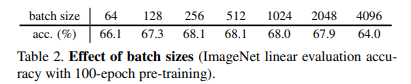 Intro에서 다룬 것과 같이 기존 방법론들은 매우 큰 batchsize를 가진 상황에서 충분한 결과를 보여줍니다. 실제로 해당 방법론에서도 Table 2와 같이 Batchsize에 대한 실험을 진행합니다. 저자는 stop-grad를 통해 ‘collapsing’을 예방했기에, 적은 batch에서도 충분한 성능을 보여준다는 것을 Table 2의 실험을 통해 증명하고자 합니다.