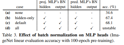 Table 3에서는 제안한 MLP 모듈들에서 BN을 사용한 경우에 대한 실험을 진행하였습니다. 실험적인 결과 적절한 양의 BN은 지도 학습과 동일하게 작동하는 것을 확인하였으나, 이러한 구조적 설계가 collpasing을 예방했다는 것이라고 볼 수 없었습니다.