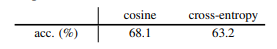 실험적인 결과, 아래의 표와 같이 consine에서는 68.1%, cross-entropy에서는 63.2%라는 성능을 보여주고 있습니다.