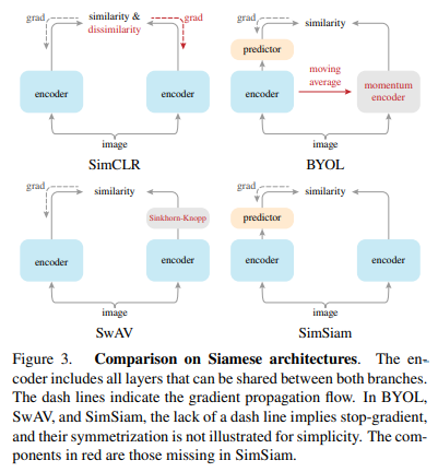 + Fig 3에서는 SOTA 방법론과의 구조적 차이점을 도식화된 것을 볼 수 있습니다. 빨간색인 부분이 빠진 부분이라고 보시면 됩니다. 위의 방법론에 stop-grad를 추가하여 실험한 내용이 있으나, 각 방법론은 grad를 적용했을 때에 최적화된 설계로 해당 방법론에 대한 이해를 위한 유의미한 결과가 없어 따로 담지는 않았습니다. 궁금하신 분들은 논문을 참고해주세요.