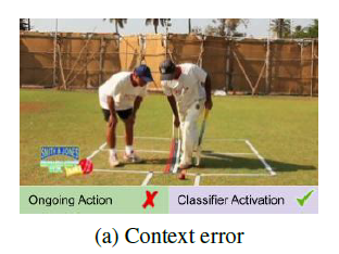 - Context error : action을 포함하지는 않지만, 장면 자체가 비디오 전체를 대표하는 느낌이 들기 때문에 Classifier가 action이라고 분류한 경우 입니다. 아래 사진을 보면 Cricket을 아직 치지 않았지만 전체적인 맥락이 Cricket shot과 비슷하기 때문에 action이라 분류한 case입니다.