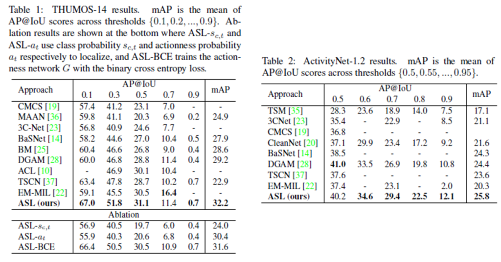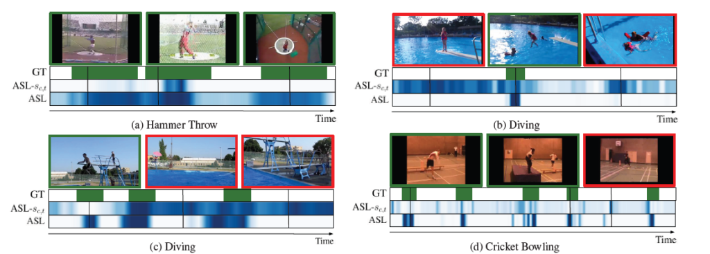 정성적 결과입니다. 파란색으로 칠해진 부분이 예측한 구간 입니다. ASLs_{c,t}는 Actioness Learning을 추가하지 않은 결과 입니다. 역시 Weakly Supervised라 그런지 완전하지는 않은 모습입니다.