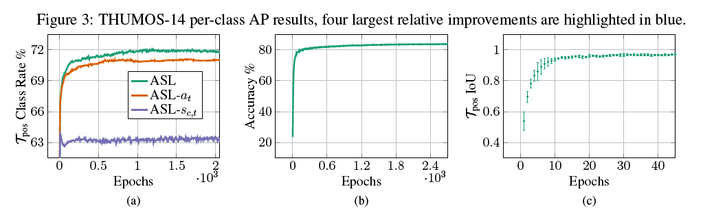 (a) 그래프를 보면 T^{pos}가 ground-truth action instance를 포함하는 비율을 나타내고 있습니다. 인상 깊은 점은 actioness 학습을 진행하지 않은 ASLs_{c,t} 은 ground-truth action instance를 포함하는 비율이 많이 낮은것을 볼 수 있는 반면 actioness 학습을 진행했다면 더 높은 비율의 ground-truth action instance를 포함하고 있음을 보여주고 있습니다.