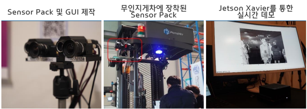 위 사진 (a)가 저희가 제작한 센서팩입니다. 맨 오른쪽이 열화상 카메라(Thermal) 그리고 그 옆 카메라가 칼라 카메라(RGB) 이며 두개의 카메라를 그림과 같이 각각 스테레오로 구성해서 각 센서마다 Disparity를 예측할 수 있도록 했습니다. 제작한 센서팩은 (b)와 같인 실제 무인지게차에 장착해서 데이터셋을 취득했으며, 취득한 데이터 셋을 이용해 보행자 인식 딥러닝 모델(SSD)를 학습한 후 (c)와 같이 실시간 데모까지 진행했습니다.