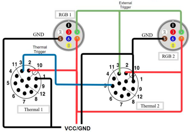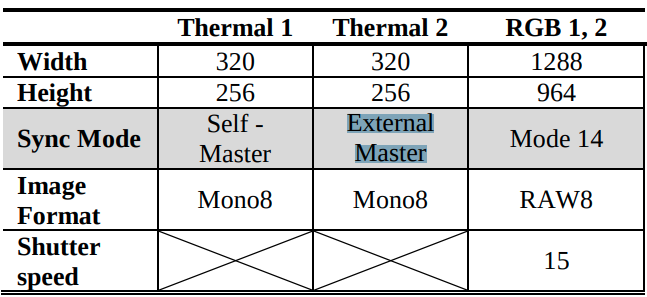 제작한 센서팩의 표 1 하드웨어 동기화 설정과 그림 2를 참고해서 보면 시그널은 Thermal1(SelfSyncmaster)->Thermal2(External Master)->RGB1,2(Slave) 순으로 전달됩니다. (이와 같은 방식은 고칠 생각입니다. 저말고… 누군가 해주지 않을까요…허허) 이러한 방식으로 네대의 카메라가 동시에 촬영되도록 하드웨어로 설정했습니다. 하지만 그림 2와 같이 결선도만 구성한다해서 동기화가 되는 것이 아니며, 표1 에 나와 있는 모든 설정을 할 수 있는 것이 아닙니다.
