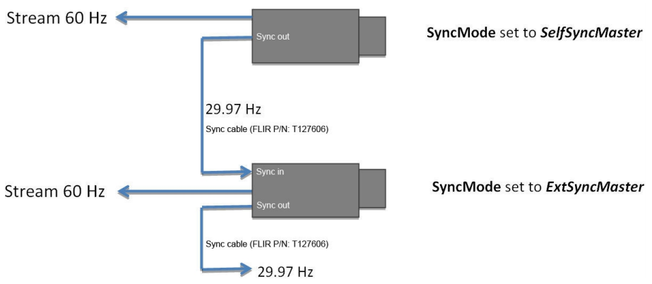 카메라 동기화를 시그널을 통해서 진행됩니다. 시그널 동작은 그림 3 과 같습니다. 시그널은 SelfSyncMaster로 설정된 열화상 카메라에서 나오며 29.97Hz로 시그널을 전달합니다. 그리고 SyncMode가 External Master 혹은 SelfSyncSlave로 설정된 카메라가 시그널을 받아서 동일한 Hz로 영상을 수집하게 됩니다. 이때 External Master와 SelfSyncSlave의 차이는 시그널을 받은 후 다시 전달 하는 것과 시그널을 받기만 한다는 차이가 있습니다.