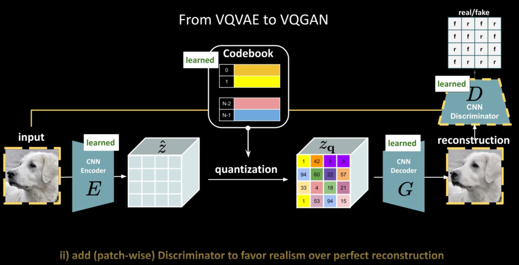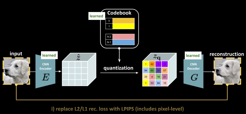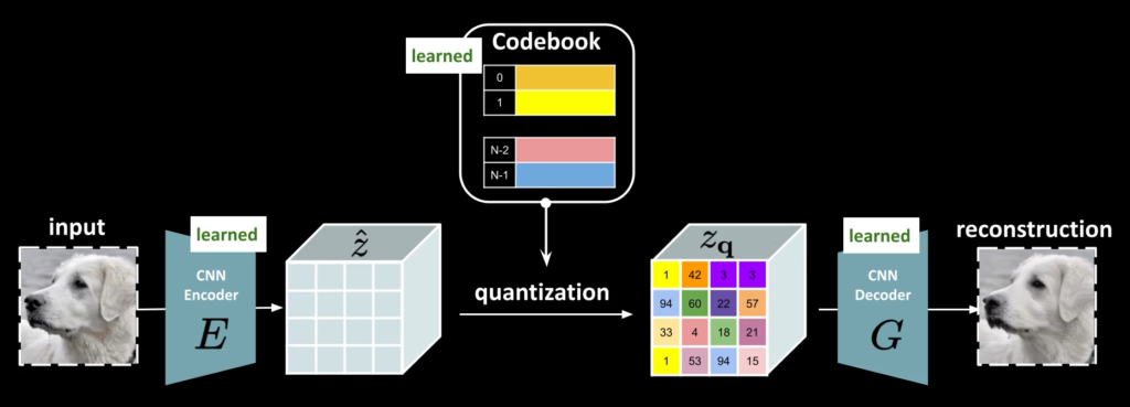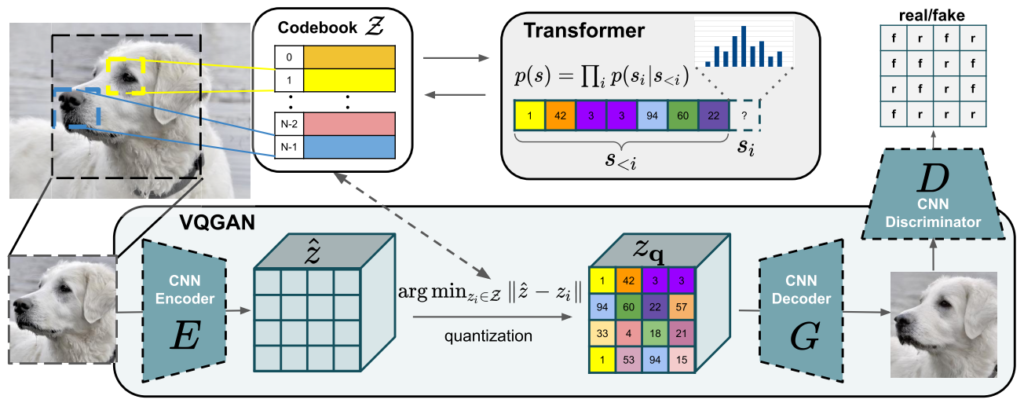 VQ-GAN의 방식은 위의 그림과 같습니다. 이미지를 CNN Encoder를 이용하여 Featuremap을 얻습니다. 그리고 각각 feature vector와 가장 유사한 codebook vector를 찾고, 그 codebook vector로 변경한 후 이를 Decode를 통해 reconstruction image를 계산하게 됩니다.