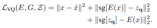 2. 해당 논문은 코드북도 학습합니다. 그리고 그 코드북은 결국 CNN인코더를 통해서 나온 벡터들을 이용해 만들게 됩니다. 그래서 인코더를 통해 만든 벡터 E(x)가 z_q와 최대한 비슷해야하며 동시에 z_q(quantization을 통해 나온 벡터 즉 코드북의 벡터)의 값과 인코더를 통해 나온 벡터 E(x)가 가까워지도록 loss를 설계해야 합니다. D(E(x)) 였던 기존 구조를 중간에 z_q가 포함되고 이로 인해 미분이 되지 않기 때문에 이 과정을 위에 stop gradient를 포함하여 loss를 설계하였습니다. 결론은 코드북도 학습하기때문에 해당 loss가 설계됐습니다.