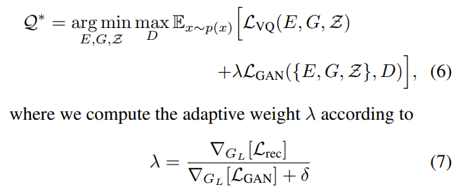 일반적으로 GAN에서 사용하는 Loss이며, 이를 추가하여 최종적으로 Codebook을 학습하기 위한 Loss는 다음과 같습니다.