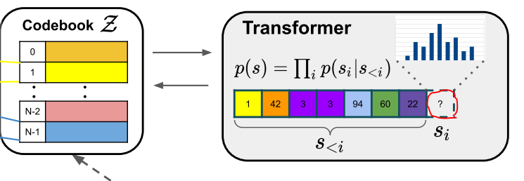 이러한 컨셉과 동일하게 앞서 잘 만들어진 Codebook을 이용하여 ‘I’ 와 같이 초기 입력을 주거나, 혹은 일부 아니면 임이의 입력을 주게되면 Transfomer를 이용하여 이후 들어갈 Code book을 생성하게되며, 이것을 앞서 학습한 VQ-GAN에 입입력하면 새로운 영상이 만들어지게 됩니다.