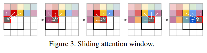 마지막으로 본 논문의 제목과 같이 고해상도의 이미지를 만들기 위한 방법은 다음과 같습니다. 일반적으로 고해상도의 이미지는 sequence voctor들이 너무 많아지게 됩니다. 그러면 많은 연산량이 필요할 수 있는데, 이를 효율적으로 수행하기 위해서 본 논문에서는 Sliding attention window를 제안하고 있으며 아래 그림과 같습니다. 즉, 주위 일부 codebook vector 만을 Transformer의 입력으로 사용하여 다음 자리에 알맞는 codebook vector를 선별하겠다는 내용입니다.