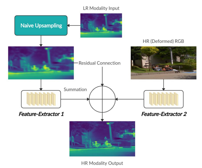 RGB, Thermal 모두 다운샘플링 하였기 때문에 아직 RGB와 Thermal의 Resolution 차이는 존재합니다. 따라서 Thermal 영상을 단순히 업샘플링하여 RGB와 맞추고, RGB와 Thermal 각각에서 Feature를 추출하여 RGB feature, Thermal feature, Theraml image를 모두 summation하여 High Resoluition 이미지를 만들게 됩니다. 여기서 그럼 Feature를 추출하는 네트워크는 어떻게 구성됐는지 궁금할 수 있는데, 논문에서는 아래와 같이 해당 네트워크를 이야기하고 있습니다.