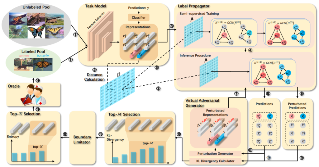 해당 논문은 Dataset 구축 비용을 효율적으로 사용하기 위한 연구인 SSL(=semi-supervised learning)과 AL(=active learning)을 결합한 것으로 두 방법론 간의 상호작용을 활발하다는 장점이 있다. SSL과 AL을 결합한 SSL-AL 방법론으로 최초는 아니지만 기존 방법론(=지도학습 task)과 달리 SSL task를 기반으로 하여 데이터를 더 효율적으로 사용하고, GAN 기반이 아닌 그래프기반으로 학습의 안정성이 높다는 장점이 있다.