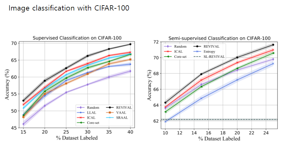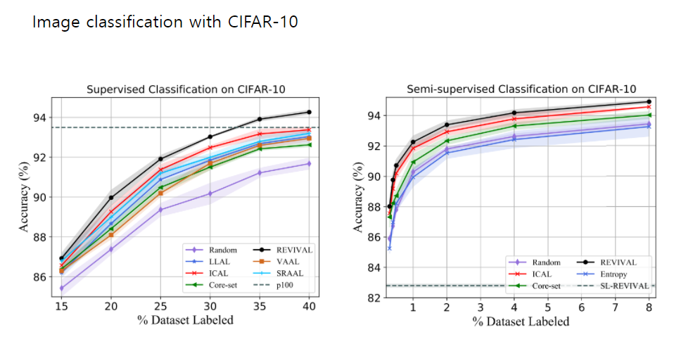 (좌) superivsed(3) 방법론과의 비교, (우) baseline(2) 방법론과의 비교. 하단 점선은 training set을 fully supervised로 학습하였을 때 성능이다.