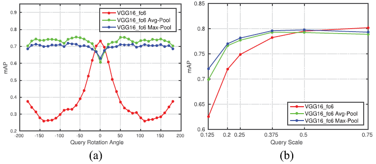 이는 Fig 2를 통한 실험에서도 나타납니다. 먼저 Fig 2는 Holidays라는 데이터 셋에서 image retrieval을 한 성능입니다. 이를 위해 당시 유명하던 VGG16을 backbone으로 활용하였습니다. 우선 (a)는 query를 -180도부터 180도까지 회전(rotation)시켰을 때 성능을 나타냅니다. (a)의 빨간 선을 보신다면, rotation이 0일 때와 0이 아닐 때 성능차이가 큰 것을 확인할 수 있습니다. 그리고 (b)는 query의 해상도를 default에서 0.125배부터 0.75배까지 변경시켰을 때의 성능을 나타냅니다. 이때도 빨간 선만을 보신다면, 해상도가 낮아질 수록 성능 차이가 큰것을 알 수 있습니다. 이러한 결과들을 통해 CNN에서 직접적으로 얻어진 feature에는 rotation과 scale에 대한 invariance가 부족한 것을 알 수 있습니다.