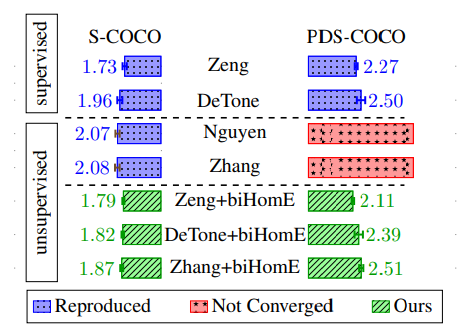 위에서 나타내는 숫자는 Mean Absolute Corner Error(MACE)를 의미하며, 결국 Supervised로 하자니 성능은 좋지만 GT를 구하는게 어렵고, Unsupervised로 하자니 Supervised에 비해성능은 떨어지고, 또 각 방법론들이 하나는 뷰포인트 변화에 약하고, 다른 하나는 조도 변화에 약한 단점을 가지고 있습니다. 해당 논문에서는 이러한 기존의 방법론들에 Loss를 한가지 제안하며 모든 방법들이 성능향상을 보이는 동시에 심지어 Unsupervised 방법임에도 불구하고 DeTone이 제안한 Supervised 방법을 이기는 성능을 나타냈다고 합니다. 그러면 해당 논문에서 제안하는 방법은 무엇일까요?