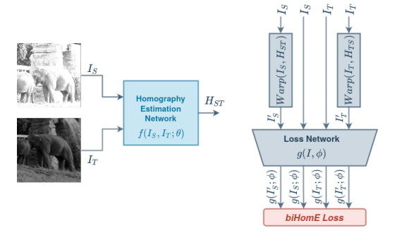 해당 논문에서 제안하는 방법은 간단합니다. 어떠한 방법이든 상관없이 기존 제안된 HEN 방법은 그대로 사용하고, 이제 Loss를 계산하는 것인데요. 위에 그림을 볼 수 있으면 알 수 있듯 Target 이미지를 H matrix (T->S) 로 변환하고, Source 이미지도 H matrix(S->T) 로 변환합니다. 즉, H matrix(S->T, T->S)를 2개를 예측하고 이를 이용하여 Target , Source , translated Traget, translated Source 총 4개의 이미지를 이용하여 Loss를 계산합니다. 뭔가 T->S, S->T 양뱡향으로 변환하며 Loss를 계산하고 있습니다. 그래서 해당 논문에서 제안하는 방법론은 ‘Bidirectional implicit Homography Estimation Loss (biHomE)’ 라고 명명합니다. 이를 수식적으로 살펴보면 다음과 같습니다.