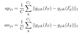 수식적으로 조금 어렵게 보이지만 실제 해당 수식에서 M은 mask라고 설명하는데, 해당 마스크는 입력되는 이미지와 동일하며 모두 1의 값을 가지는 Matrix입니다. 결국 M을 이용한 텀은 평균을 구하는 것이고 결국 핵심은 max(..) 이부분인데 여기서 ap는 anchor_positive channel aggregated distance, np는 negative channel aggregated distance를 의미한다고 합니다. 이를 수식으로 나타내면 아래와 같습니다.