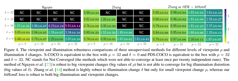 먼저 자신들의 방법을 통해서 기존 unsupervised 방법들이 각각 가지고 있던 뷰포인트 혹은 조도변화에 취약했던 부분을 극복할 수 있는지 확인합니다. 위의 분포에서 x축은 뷰포인트, y축은 조도변화를 나타냅니다. 각각 값에 대한 디테일은 논문에서 평가에 사용한 데이터셋을 사용하며 나타내는데 해당 내용은 넘어가도록 하겠습니다. ( 간략하게 조도는 constrast, saturation, hue noise를 준 정도를 나타내며, 뷰포인트는 [-ρ, ρ]range에서 랜덤하게 vertically and horizontally perturbed한 결과라고 합니다.)