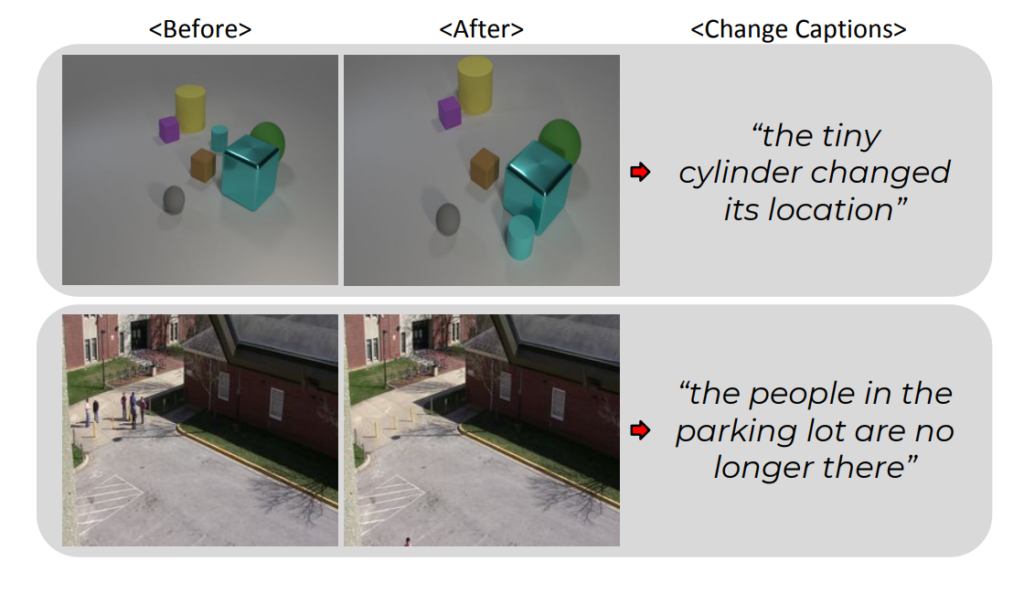 그리고 마지막에 더 신기했던건 아래와 같이 변화된 내용을 캡셔닝으로 나타내는 분야가 있다고 합니다. ( ICCV에 나왔고, 한국인이 1저자이시네요.)