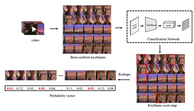 SKE 모듈은 주어진 입력 비디오의 프레임을 32×32 크기로 줄인 뒤, 총 24×24개의 프레임을 Fig 2와 같이 정사각형으로 이어붙여 사용합니다. 그 후, 각각의 프레임들을 classification network를 통과시켜 classification score를 예측하고, 총 24×24 크기의 score map을 얻어냅니다. 이때, classification network로는 MobileNet이 사용되었습니다. 얻어낸 score map을 BCE Loss를 통해 학습을 시키는데, 학습을 위한 label은 해당 프레임이 keyframe인지 아닌지에 대한 것으로 “Optimally grouped deep features using normalized cost for video scene detection”에서와 동일하게 사용하였다고 합니다.(유료네요..) 이후, 해당 score map을 하나의 벡터 형태로 쭉 펼치고 thresholding하여 binary mask로 만든 뒤, 다음 모듈의 입력으로 사용하게 됩니다.