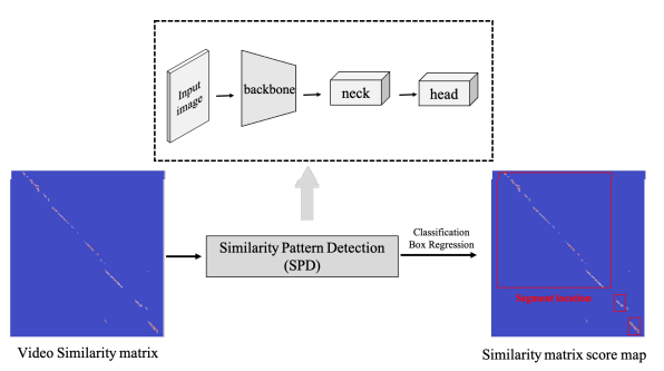 이번에 설명드릴 것은 SSAN의 두번째 모듈 Similarity Pattern Detection (SPD) 모듈입니다. 해당 모듈은 ViSiL과 유사하게 먼저 frame-to-frame similarity map을 만듭니다. 조금 다른 점은 두 비디오 간의 similarity map을 만들 때, ViSiL에서는 각 frame-level feature 들 간의 chamfer similarity를 계산하였다면 해당 논문에서는 cosine similarity를 사용하였습니다. 두 비디오 간의 similarity map을 만든 후, 해당 map에서 segment-level alignment를 다루기 위해 object detection과 같이 접근하였습니다. Similarity map에서 어떤 부분이 서로 연관되어 있는 지를 detection 하는 것으로, detection된 box의 행은 두 비디오 중 특정 한 비디오의 segment, 열은 나머지 비디오의 segment를 의미하게 됩니다. 이처럼 similarity map에서 detection을 하는 SPD 모듈은 classification head와 regression head로 구성되어 있으며, 각각 BCE Loss와 GIoU Loss로 학습됩니다. 그리고 학습 시 필요한 bounding box 정보와 binary class 정보(서로 연관 있는지 없는지)는 데이터 셋에 annotation 되어 있는 segment-level relevant 정보를 활용하였다고 합니다.