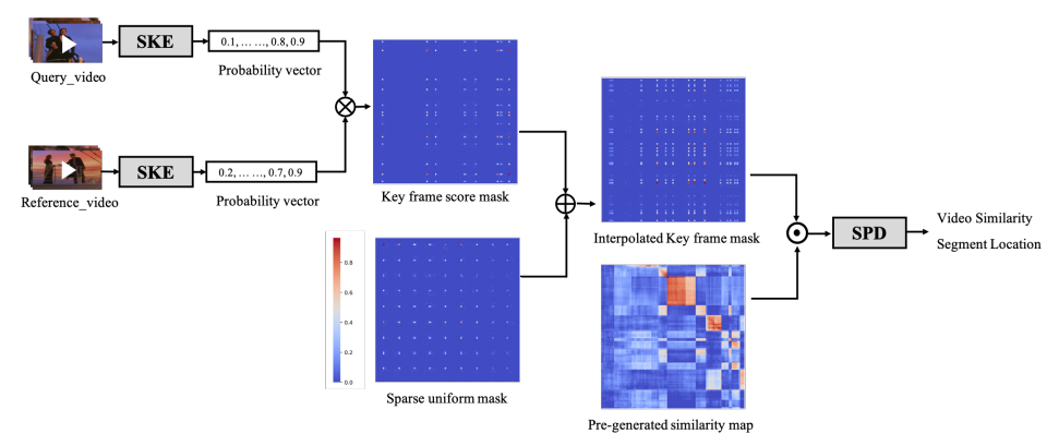 SKE 모듈에서 추출된 keyframe은 비디오 마다 서로 다른 위치에 존재하기에 다양한 similarity pattern을 만들어냅니다. 이러한 다양한 pattern은 이어지는 모듈 SPD를 robust하게 도울 수 있기 때문에, SKE와 SPD를 end-to-end 방식으로 학습하였다고 합니다. 학습 과정에 대해 자세하게 설명 드리자면, 우선 두 비디오에서 각각 keyframe score로 만들어진 binary mask를 생성하고 BCE Loss를 통해 학습합니다. 그리고 이 두 binary mask 중 하나를 transpose 하여 행렬 곱 연산을 취합니다. 이를 통해 두 비디오 간의 keyframe score mask를 생성하고, 해당 mask로 frame-to-frame similarity를 필터링 하여 SPD 모듈의 입력으로 사용합니다. 이 때, keyframe이 하나도 안뽑혀 SPD 모듈의 입력이 없는 것을 방지하고자 sparse한 uniform mask를 생성 및 필터링 시 적용하여, 최소한의 keyframe을 보장해주었다고합니다. SPD 모듈에서는 이를 입력으로 segment의 similarity와 location을 학습합니다.
