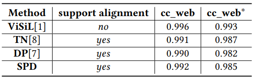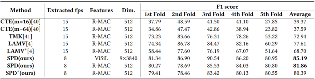 Table 1. Comparison of SPD and state-of-the-art for temporal alignment on VCDB with 5-fold evaluation.