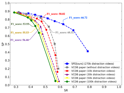 우선 SSAN은 Segment-level 의 CBVR을 다루었기에 VCDB에서 temporal alignment 성능을 측정하였습니다. 측정 방식은 VCDB 내의 core datase을 5 fold로 나누어 학습하였으며, F1-score를 통해 평가하였습니다. Table 1에서 보이듯, 평균적인 성능이 기존 방법론들 대비 꽤나 좋은 것을 보였습니다. 또한 VCDB paper에서 보였던 Fig 5와 같이, background dataset이 많이 추가되었음에도 불구하고 좋은 SP-SR curve를 보였습니다. 이를 통해 segment-level에서 large scale video retrieval 성능을 보였다고 합니다. (그러나 제가 알기로는 SP와 SR이 similarity rank를 매기고 있지는 않은 것으로 알고 있는데.. 흠)