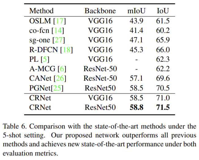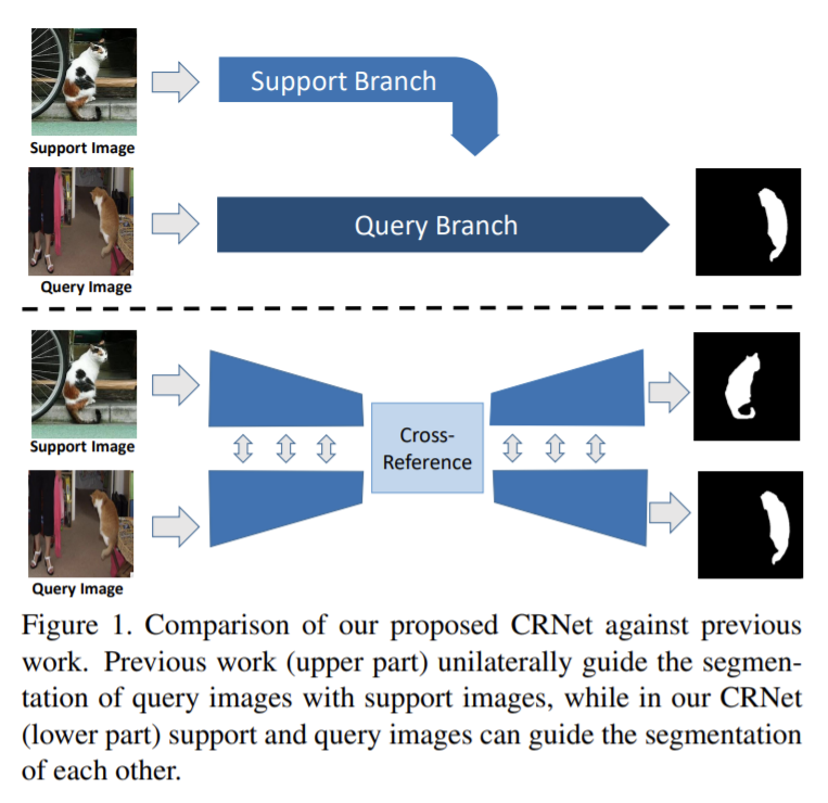 본 논문은 support-query 이미지 쌍의 관계가 few-shot segmentation에 필수적이라 주장하며 두 이미지가 서로 segmentation을 안내하는 CRNet을 제안한다. few-shot 분할을 수행하는 방법을 학습하며, support-query 이미지 쌍을 siames encoder로 심층 특징으로 인코딩 한 뒤 cross-reference 모듈을 적용해 두 이미지에 공존하는 객체의 특징을 채굴한다. 라벨링 된 마스크를 활용하기 위해 조건부 모듈은 전경 예측을 위한 support 셋의 카테고리 정보를 통합하며 마스크 조정 모듈은 최종 전경 예측을 위한 신뢰 영역 맵을 반복적으로 저장한다. k-shot의 경우 이전 연구는 다른 1-shot의 평균을 이용하여 조정하였으나 해당 논문은 더 많은 support 이미지를 사용하도록 최적화 기반의 방법을 적용하여 모델을 조정한다.