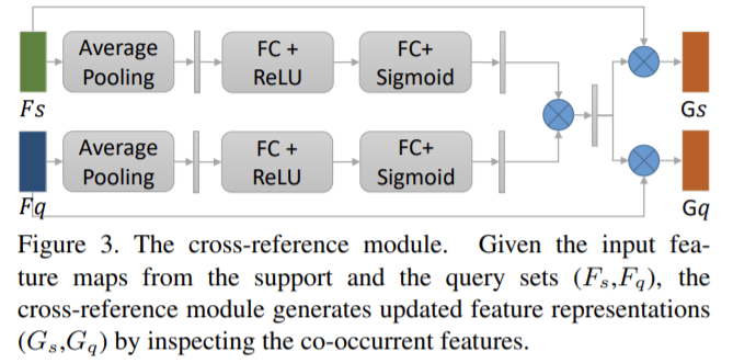파라미터를 공유하는 CNN쌍으로 으로 query 이미지와 support 이미지를 특징맵으로 인코딩한다.동일한 공간으로 이미지를 내장하여 cross-reference 모듈은 전경을 찾기 위한 공통의 특징을 더 잘 뽑을 수 있다. 대표적인 특징 임베딩을 얻기 위해 skip connection을 활용한다.