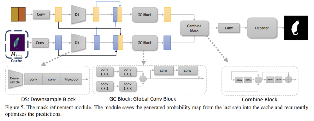 또한 물체의 모양이 큰 차이가 있으므로 예측을 반복적으로 다듬기 위해 효과적인 마스크 개선 모듈을 개발한다. 초기 예측을 통해 네트워크는 높은 신뢰도의 시드 영역을 찾아 확률 맵 형태로 모듈에 저장하고 이후 예측에 사용한다. 새로운 예측을 할 때마다 업데이트를 하면 마스크 조정 모듈을 몇단계 실행하여 전경을 더 잘 예측할 수 있다.