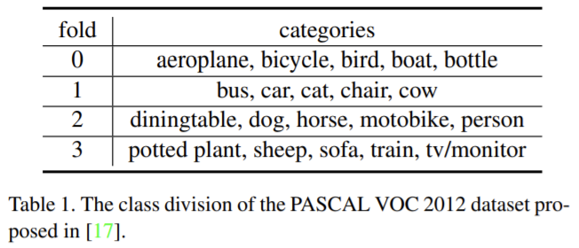 - 20개의 객체 카테고리를 균등하게 나눠 4 folds를 만들고 그중 3 fold는 학습 class, 하나는 test class로 이용(표 참고). 4개의 fold를 test에 사용하여 4번의 평균을 이용하여 성능을 측정함.