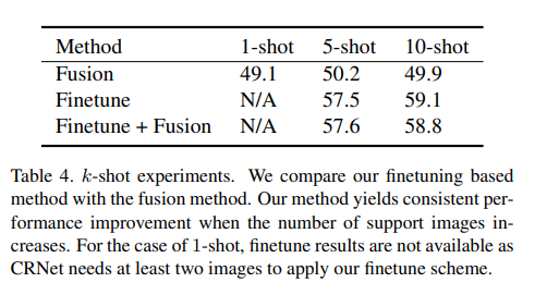 k-shot learning은 여러 레이블이 지정된 support의 이점을 활용하기 위해 네트워크를 미세 조정할 것을 제안한다. 본 논문의 네트워크는 한번에 두 이미지를 예측할 수 있으므로 네트워크 미세 조정에 최대 k^2개의 이미지 쌍을 이용할 수 있다. test에서 모델을 미세조정하기 위해 라벨이 지정된 support 이미지에서 무작위로 샘플링을 하고 Siamese 인코더의 매개 변수를 고정한 뒤 나머지 모듈만 미세조정한다. 실험을 통해 논문에서 제안한 미세조정을 통해 성능이 지속적으로 오르고 퓨전 기반의 방식은 support 이미지 수가 증가할 때 종종 saturation된 성능을 얻을 수 있음을 입증한다.