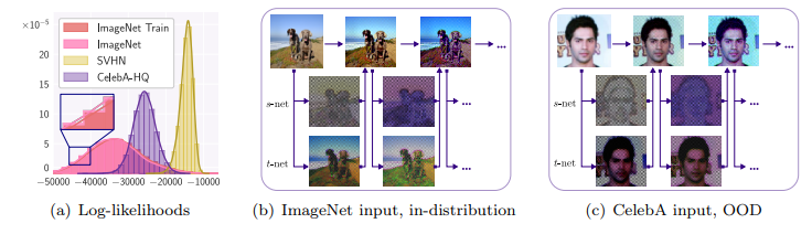 하지만 NF 기대한 바와는 다르게 좋지 못한 성능을 보여줍니다. 이를 증명하기 위해 저자는 NF 모델의 근본으로 불리우는 RealNVP를 베이스 모델로 실험을 진행하였습니다. Fig 1은 ImageNET으로 학습된 RealNVP에서 SVHN, CelebA-HQ를 out-of-distiribution으로 설정한 실험 결과 입니다. Fig 1-(a)를 보면 OOD에서 가장 높은 likelihood를 보여야 할 ImageNet이 아닌 OOD 데이터~SVHN,CelebA-HQ에서 높은 likelihood를 보여주며, 정량적인 결과에서도 문제가 있음을 보입니다. 또한 fig 1-(b,c)를 보면 OOD나 in-distribution에서도 물체의 엣지와 밝기, 색상 등에 관심을 가지는 것을 볼 수 있습니다.