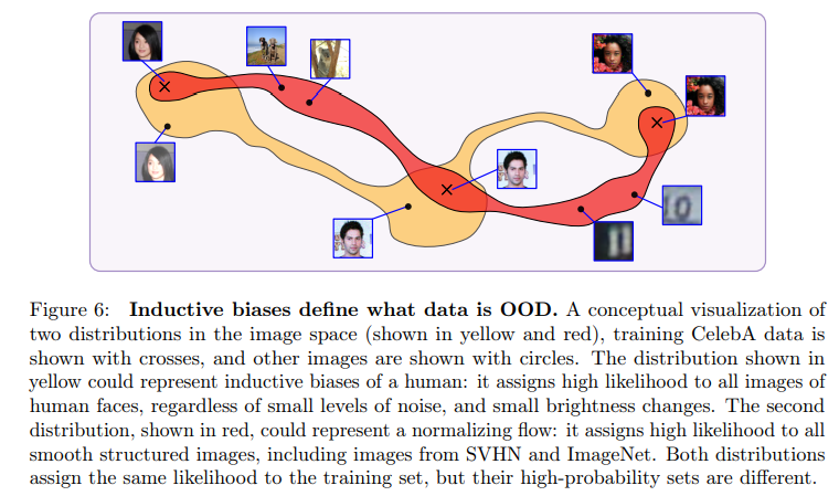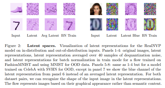 가장 먼저 저자는 NF의 latent feature가 어디를 보는지 확인했습니다. 실험적인 결과, Fig 2와 같이 OOD에서 graphical feature를 보이는 특성이 가지고 있으며, 영상 내의 semantic fetrue에는 관심을 가지지 않는 모습을 보여줍니다. 즉, 위에서 주장한 기존 NF의 ‘inductive bias'(fig 6의 red)를 가지는 것을 증명합니다. 그럼 왜 low-level feature만 보는 이유가 무엇일까요?