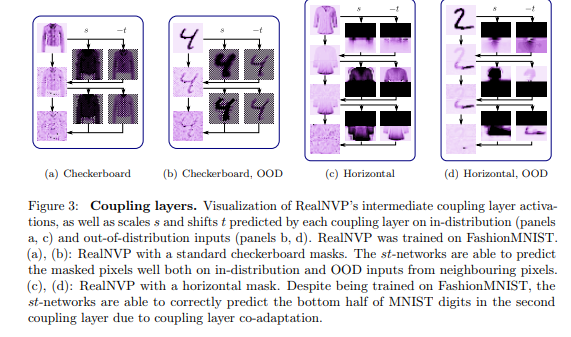 Coupling layer의 특성을 보다 자세히 들여다 보기 위해 Fig 3-(c,d)에서는 RealNVP에서 기준으로 제안된 horizontal mask를 이용한 분석을 수행했습니다. 실험적인 결과, in-dist, OOD 데이터 셋에서 모두 첫번쨰 레이어에서는 형태를 알아볼 수 없는 값을 추정되지만, 두번째 레이어 이후부터는 점차 형태가 보이는 정확한 예측을 수행합니다. 즉, 이전 레이어에서는 값을 encoding하고, 다음 레이어에서는 이를 decoding하는 co-adaptaion한 과정이 존재한다는 것을 보여줍니다. 고로 OOD에서는 주변 픽셀을 고려하도록 남기는 것보다는 전체를 소실시키는 것이 상대적으로 semantic feature를 볼 가능성이 높아짐으로 보여줍니다.