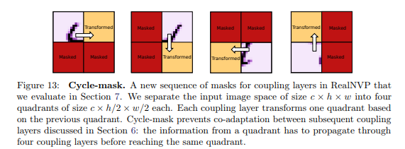 위의 섹션 background에서 설명한 바와 같이 기존 NF는coupling layer의 s-Net, t-Ne와 데이터를 나누기 위한 기법 mask(위에서는 checkboard mask)를 사용한다고 이야기했습니다. 이러한 기존 기법을 이용하여 실험적으로 분석한 결과 fig 3과 같은 결과를 보여줍니다.