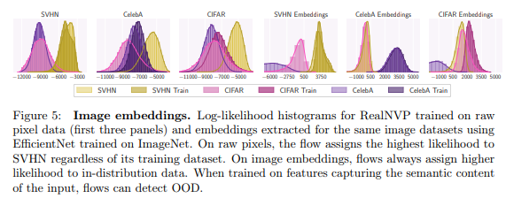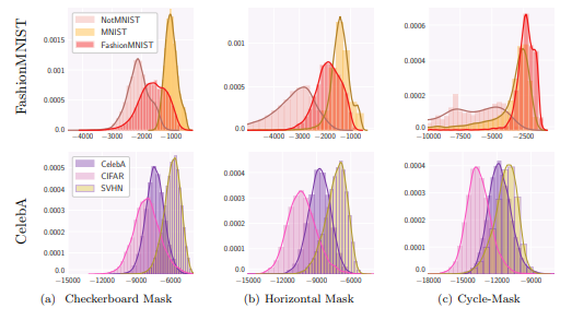 수식 1은 이전 리뷰에서 다룬 바와 같이 학습 데이터 셋 D의 likelihood를 직접적으로 예측하기 위한 데이터 x와 모델 f로부터 변환된 latent feature z의 가능도에 대한 변수 변환 입니다. 그렇기에 모델이 학습 데이터와 유사한 분포를 가진 데이터에서는 높은 가능도를 보여주고 다른 분포를 가진 데이터 셋의 데이터에서는 낮은 가능도를 보이는 것이 당연한 순리로 보입니다.