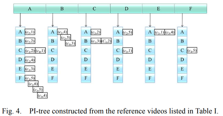 video c1 에 대한 i-pattern 중 첫번째 인덱스에 있는게 EA 라고 할 때, 위 그래프의 col : E, row : A 를 보면 (c1,1)이 들어가 있습니다. 모든 pattern, video 에 대해 이 단계들을 반복해서 PI-tree 를 구성합니다.