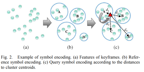 - K-means clsutering 을 사용하여, 비슷한 feature 의 keyframes 끼리 cluster 를 만들고 해당 cluster를 나타내는 symbol 을 정의한다. (symobl encoding.)
