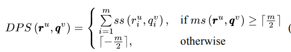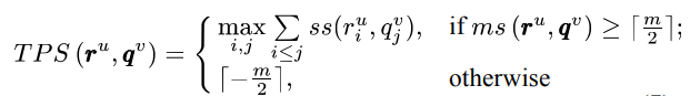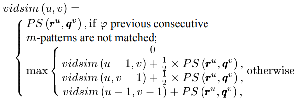 - 어떤 reference video RV 의 u번째 m-pattern 을 r^u 라고 하고, 어떤 query video QV 의 v번째 m-pattern 을 q^v 라고 했을 때, 이 둘의 video similarity 는 아래와 같습니다.