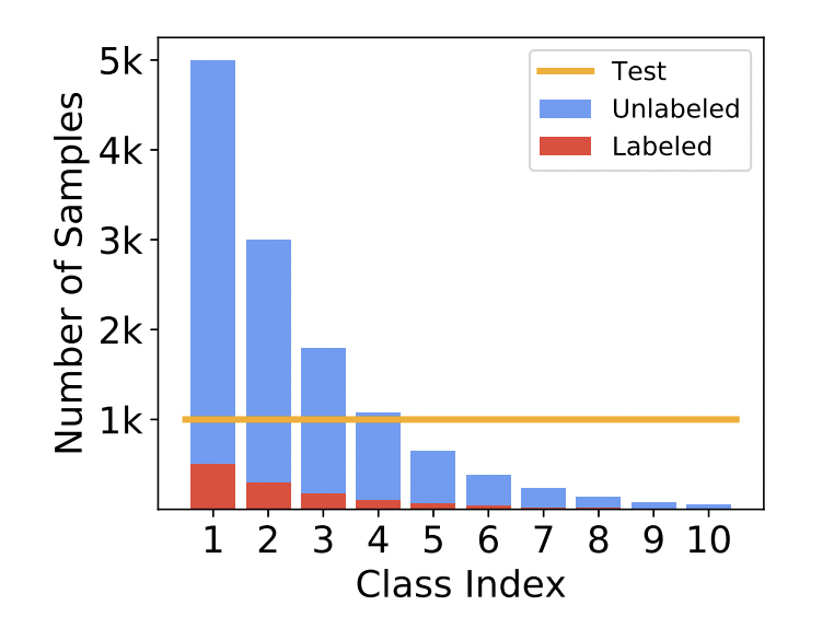 따라서 본 논문에서는 아래 그림과 같이 labeled와 unlabeled 가 비슷한 분포를 갖는 불균형 데이터에 대한 문제를 해결하고자 하였습니다.