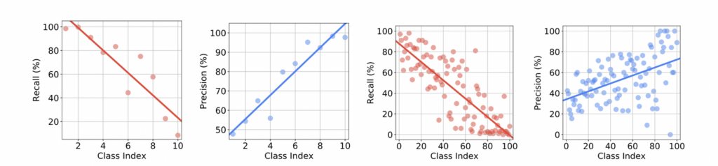 첫번째 그래프인 CIFAR10-LT을 보면 가장 많은 클래스와 두 번째로 많은 클래스의 recall은 각각 98.5%와 99.7%인 반면, 가장 작은 클래스의 recall은 8.4%입니다. 다시 말해, 모델은 majority-class에 대해 크게 편향되었습니다.