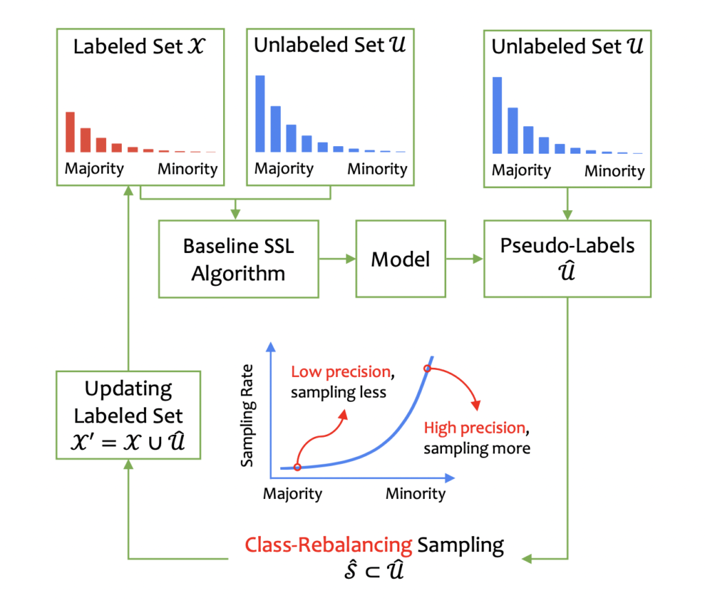 본 논문에서는 Unlabeled-set과 Pseudo-labeled set을 적응적으로 샘플링하여 원래 labeled-set을 보완한 후, baseline SSL 모델을 재학습하는 class-rebalancing selftraining scheme (CReST) 를 제안합니다. unlabeled-set의 pseudo-label이 label-set에 추가되어 재학습 과정에서, minority class로 예측되는 데이터를 (precision이 높으니) 더 높은 확률로 샘플링할 수 있도록 확률적 업데이트를 적용시킨 방법입니다. 이 업데이트 확률은 labeled-set에서 추정된 데이터 분포 함수가 됩니다.