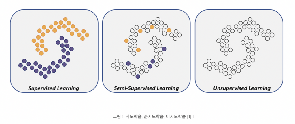그 차이는 아래 그림을 통해 쉽게 확인할 수 있을 것 같습니다. ** 색이 있는 것이 레이블링된 데이터*