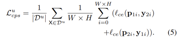 P_1 (P_2)f(θ_1) (f(θ_2))로 부터 나온 segmentation confidence map이고, f(θ_1)f(θ_2)는 서로 같은 구조를 가지고 초기화만 다르게 된 두 네트워크이다. 두 모델은 서로 예측 결과를 pseudo label로 이용하여 학습을 진행하게 되고, loss는 supervision loss인 \mathcal{L}_s\mathcal{L}_{cps} 로 구성된다. \mathcal{L}_s는 labeled 데이터를 이용하여 두 모델의 예측 결과와 정답의 픽셀 단위 cross-entrophy loss이고, \mathcal{L}_{cps} \mathcal{D}^u \mathcal{D}^l 에 대해 상대 네트워크의 출력 값을 정답값으로 하는 cross-entrophy loss이다.