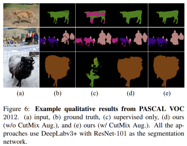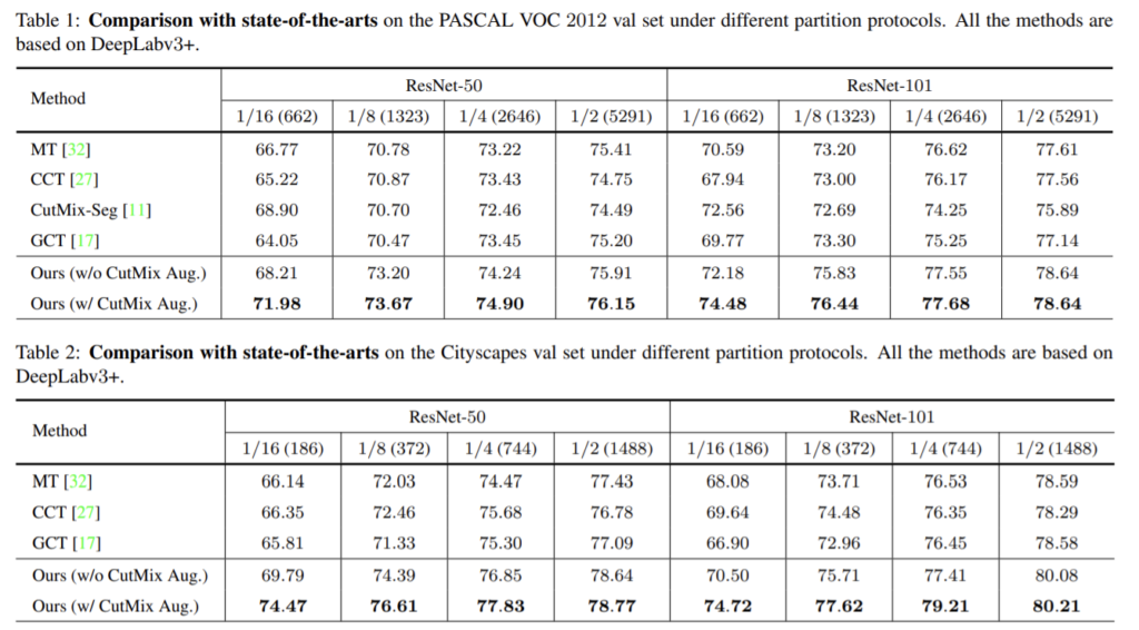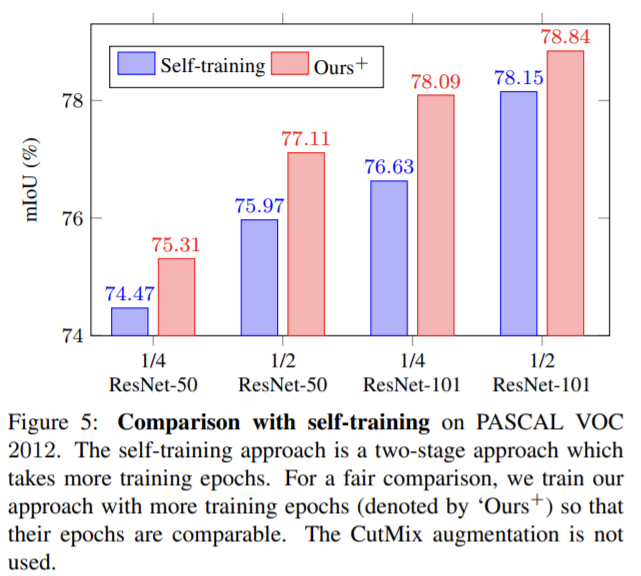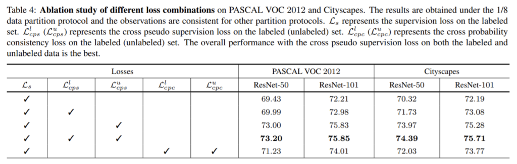 cross probabilityconsistency는 그림1의 (b) 방식으로, 두 네트워크의 교차 확률이 유사하도록 한다. 이와 유사하게 제안한 CPS도 두 변동적인 네트워크가 서로 유사하도록 학습한다. 이때 unlabeled 데이터에 대해 pseudo label을 이용하여 데이터를 보완함으로써 표4에서 확인할 수 있듯이 성능을 향상시킨다. (표4의 마지막행 결과가 cross probability consistency, 4번째 행의 결과가 CPS 성능)